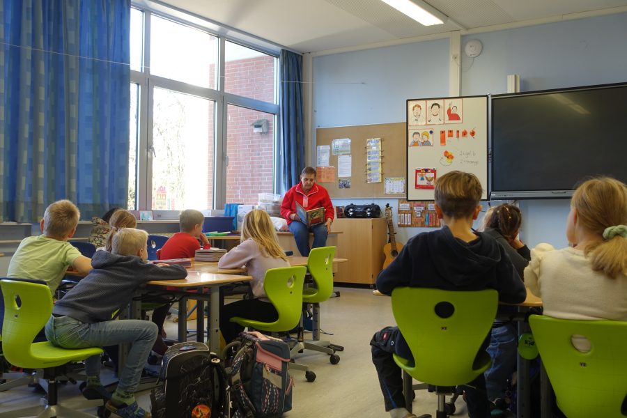 Der erste Jahrgang besuchte im Rahmen des Vorlesetags dreimal die Bücherei in Borsum. Die Bücherei wurde erkundet und durchstöbert. Die SchülerInnen erhielten einen Büchereiausweis, einen Bücherrucksack und konnten Bücher ausleihen. Außerdem wurde den Kindern jedes Mal eine großartige Geschichte von den Damen aus der Bücherei vorgelesen.