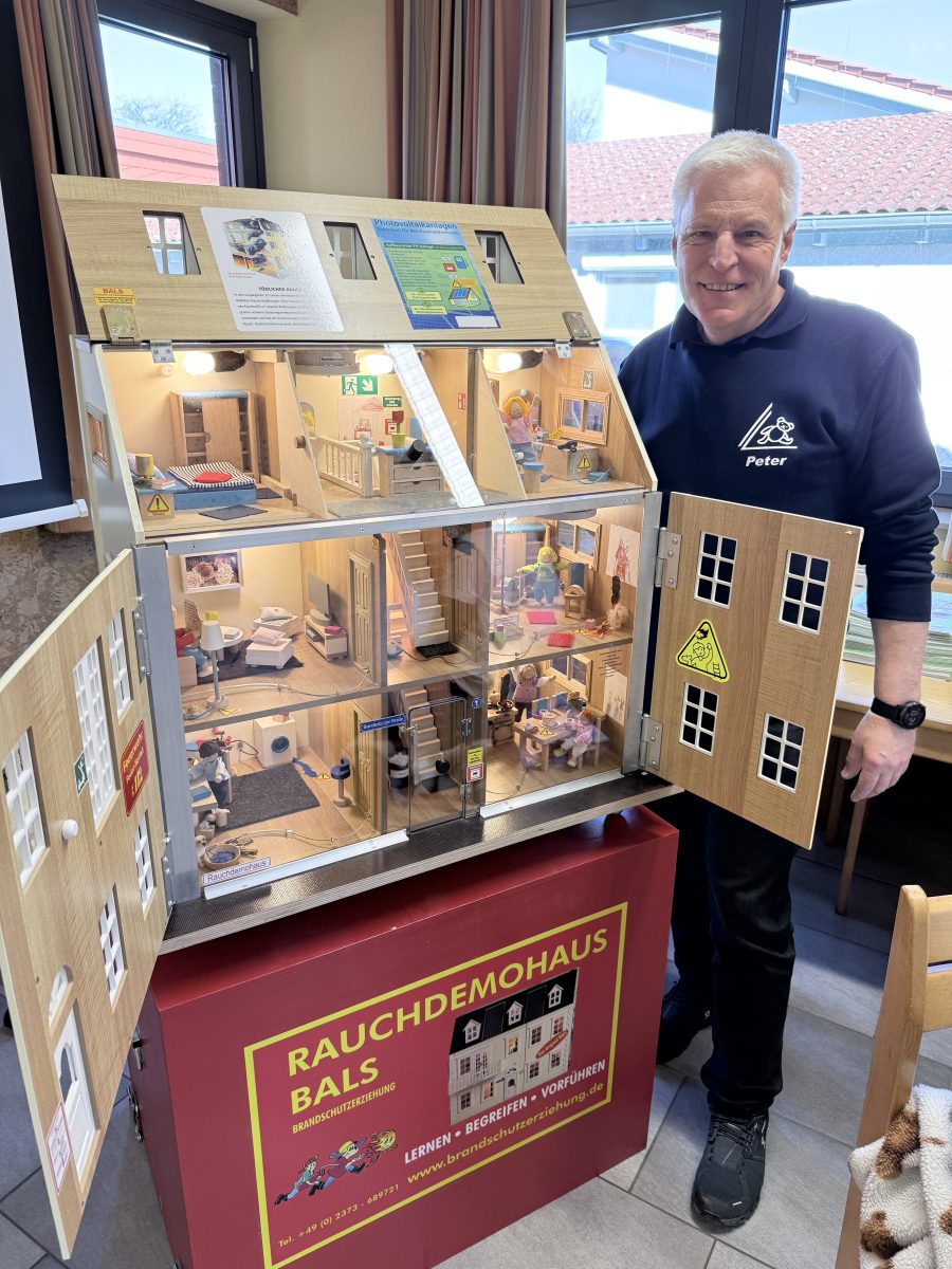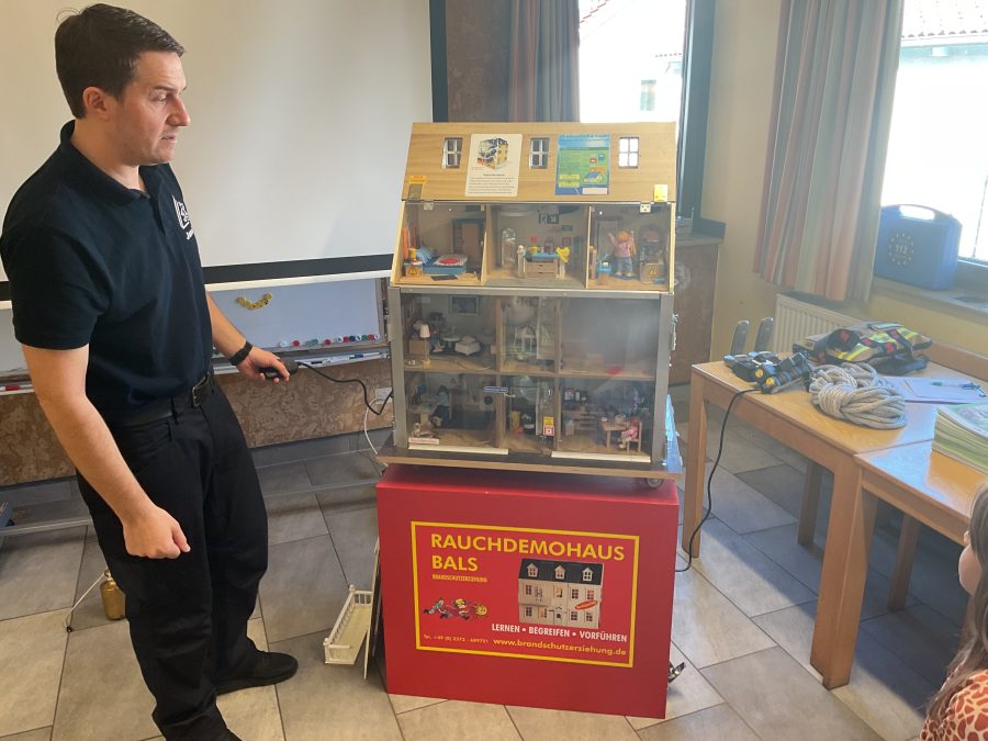 Ein weiteres Highlight war das Rauchdemohaus mit dessen Hilfe verschiedene Brände simuliert wurden. Das Haus sah auf den ersten Blick wie ein kleines Puppenhaus aus, war aber mit echtem Rauch und Feuermeldern ausgestattet. Die Jungs und Mädchen mussten erneut einen Notruf (Übungstelefon) absetzen und die 112 wählen.