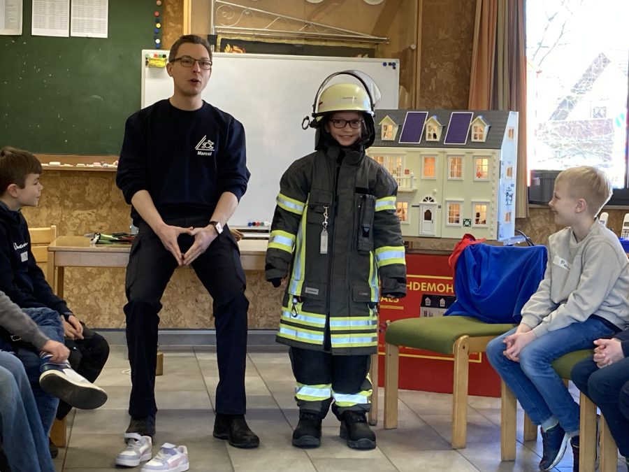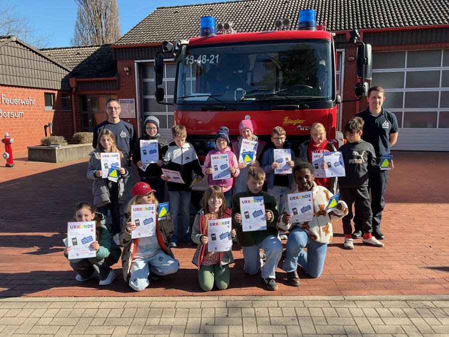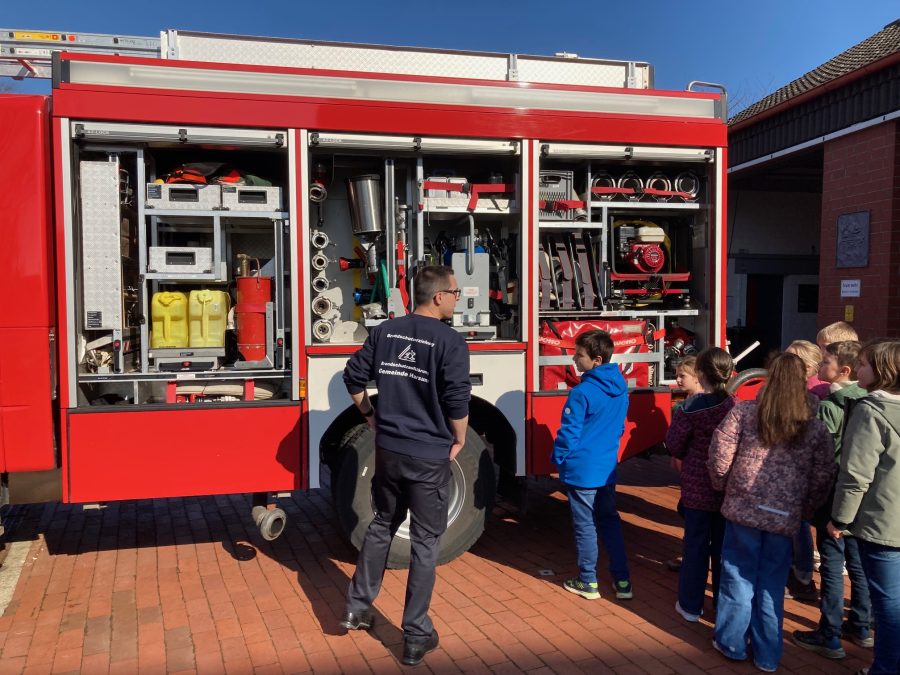 Nach dem Theorieteil im Klassenraum ging es zu Besuch ins Feuerwehrhaus in Borsum. Dort wurde den Schülerinnen und Schülern die Ausrüstung eines Feuerwehrmannes vorgestellt und ein Kind durfte sie sogar anprobieren. Die Kinder waren verblüfft, als sie erfuhren, dass ein Feuerwehrmann im Ernstfall in nur 30 bis 45 Sekunden einsatzbereit sein muss – inklusive Hose, Stiefeln, Jacke, Helm und Handschuhen!