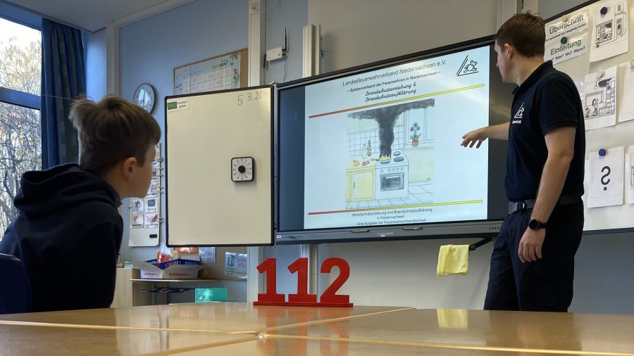 Was aber ist zu tun, wenn es brennt? Dann hilft nur noch die Nummer 112 und man muss einen Notruf absetzen. Genau das wurde anschließend anhand vieler kleiner Bildergeschichten auch praktisch geübt. Einige Schülerinnen und Schüler mussten von einem Übungstelefon aus einen Feuerwehrmann im Nachbarraum anrufen und stellten ein echtes Telefonat mit der Rettungsleitstelle nach. Die Kinder merkten schnell, wie aufgeregt man in solch einem Moment ist. In Stresssituation die Ruhe zu bewahren und die wichtigen Informationen durchzugeben, ist gar nicht so einfach.